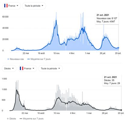 Si le vaccin était efficace on n’aurait guère besoin d’aller au-delà en forçant les populations résiduelles à se faire vacciner. Mais voilà on a un doute, non seulement sur les effets secondaires de ces vaccins, après AstraZeneca qui est passé à la trappe à cause des effets secondaires qu’il engendrait, c’est au tour de Moderna, le vaccin le plus cher du marché, d’être sur la sellette[3]. Quant à Elisabeth Borne, ministre du patronat et du chômage, elle n’excluait pas que la perte du pass sanitaire pourrait être liée au refus d’une troisième dose[4]. La dictature sanitaire – je n’ai pas d’autre mot – modifie les paramètres de sa propre politique, à son gré et demande qu’on lui laisse les mains libres en la matière. Ces propos rassemblés montrent que des travailleurs, même vaccinés deux fois, perdraient leur accès à l’emploi, seraient suspendus avec perte de salaire, s’ils se refusaient à une troisième puis à une quatrième dose. Et pourquoi pas une cinquième ! Il n’y a pas d’horizon et pas de fin à cette ignominie. Cette prolongation du pass sanitaire qui vise à vendre toujours plus de doses à discrétion – Pfizer peut se féliciter de l’élimination d’AstraZeneca et de Moderna, il se retrouve pratiquement seul sur un marché captif – intervient justement au moment où la pandémie a nettement régressé comme le montrent les graphiques suivants. La canaille politicienne vous dira que nous risquons une cinquième vague, ceinture et bretelles, il vaut mieux prévoir.